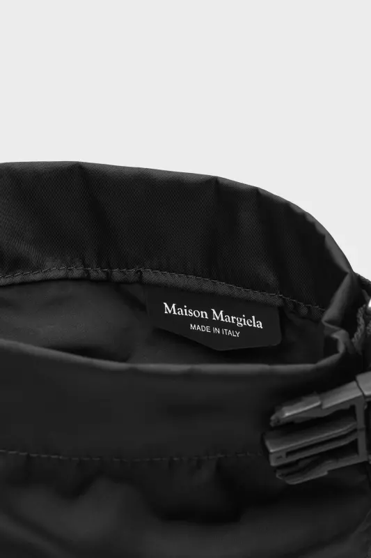 Inspired by outdoor wear, the roll-up bag comes in nylon with a detachable, adjustable strap and a buckle, which is accented with the Maison Margiela numerical logo. A clear slot appears at the front with the logo. Maison Margiela's signature, the Four stitches, appear at the back; the opposite of a label.