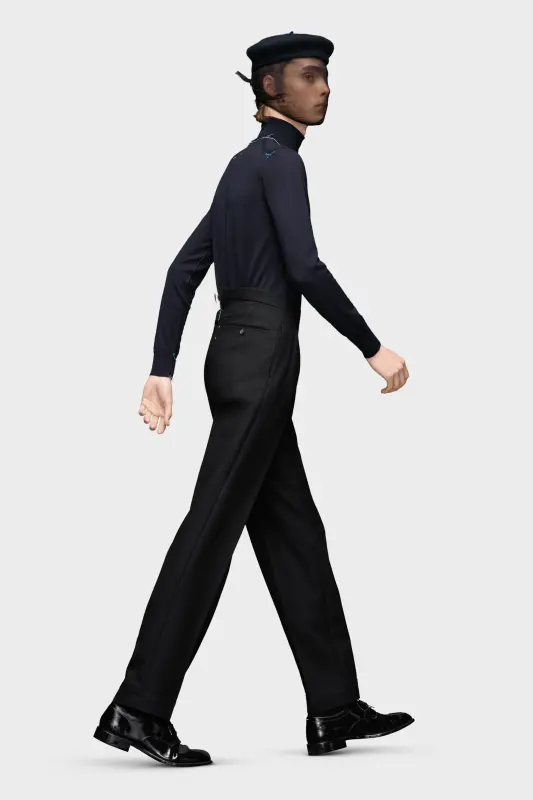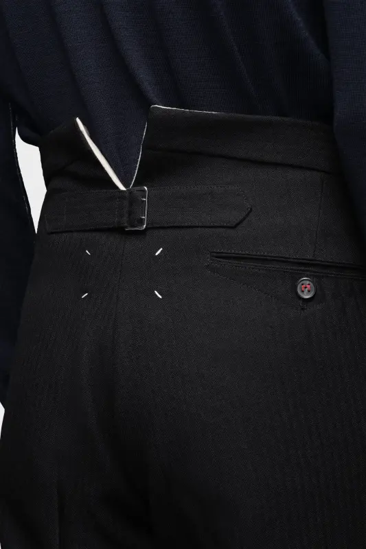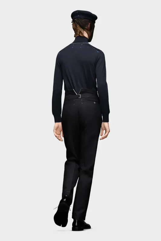 In British mohair, these cropped pleated trousers feature zipped sides at the waist and the M button and Maison Margiela hook and eye closure. They are designed with pockets. At the back, the four white stitches show the hand of the Maison: the opposite of a label.