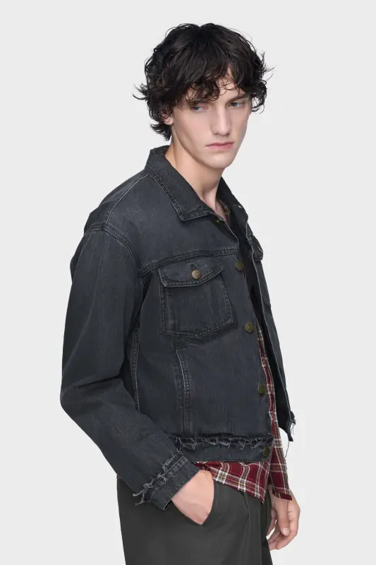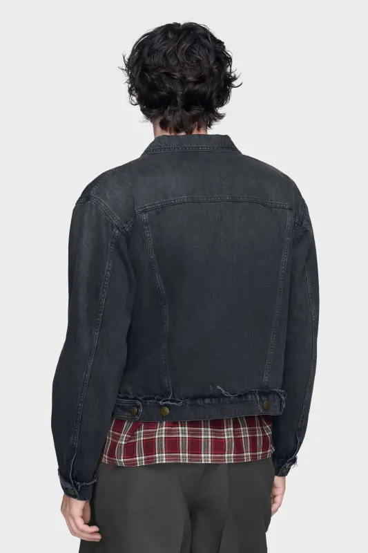 Crafted from washed denim, this caban jacket reveals signs of lived wear: fading, softened lines and gentle fraying at the hem. The silhouette maintains the structure of naval tailoring, reinterpreted through a fabric rooted in workwear. A study in contrasts, it elevates the familiar through subtle distortion. At the back, the Maison’s signature four stitches appear; the opposite of a label.