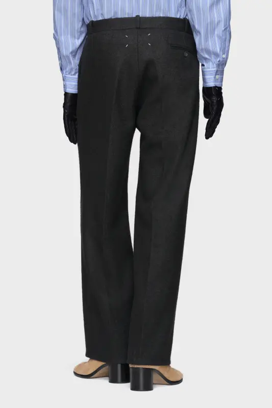 These straight-leg trousers are tailored in felted wool for a softly structured finish. Belt loops, side slip pockets and pressed creases recall formal construction, while the pared-back silhouette keeps the line modern. At the back, the Maison’s signature four stitches appear; the opposite of a label.