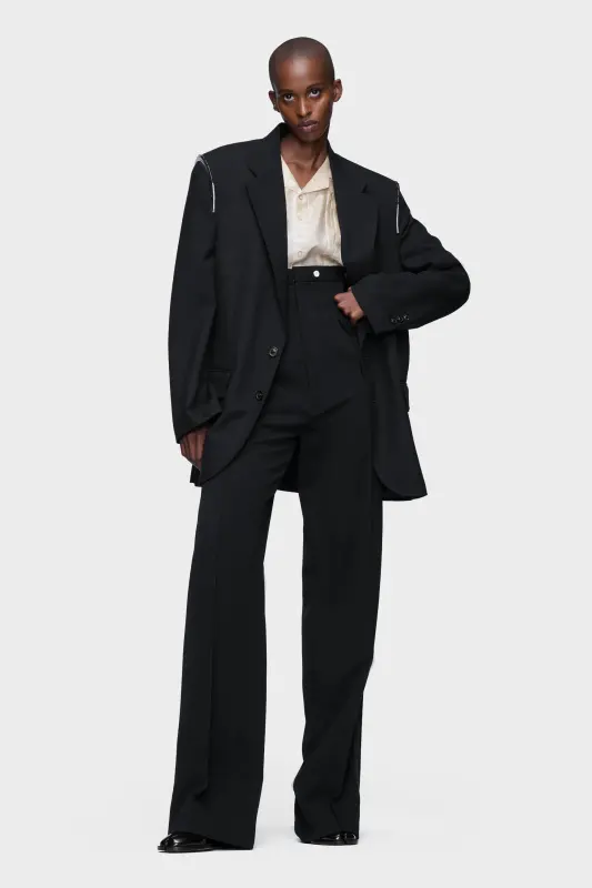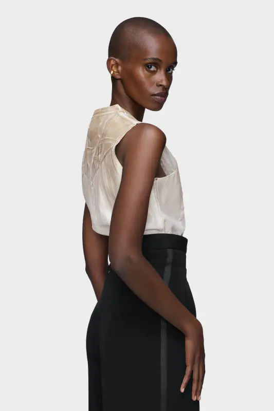 This sleeveless shirt is crafted in cotton with the Maison’s pressed and foiled technique, transforming the fabric through heat and pressure to create a lustrous, tactile finish. Vertical pleats and a pointed collar lend structure to the fluid form, while the reflective surface redefines its texture and light. At the back, the Maison’s signature four stitches appear; the opposite of a label.