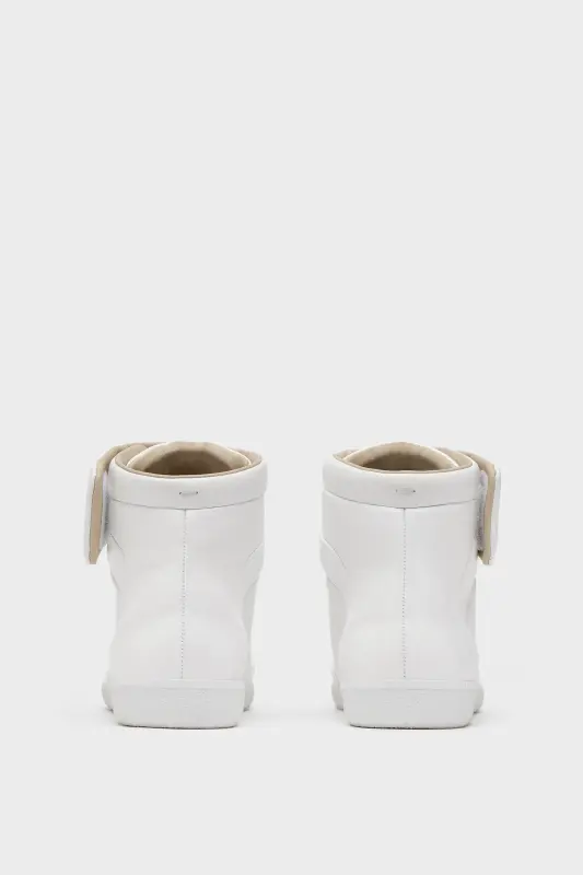 Originally launched in the SS11 collection, the Future sneaker is reintroduced this season. Defined by its seamless construction and concealed fastening. Built without visible laces, a hidden strap folds across the tongue to create a uniform surface, evoking anonymity and restraint. Crafted in soft calfskin, the mid-top silhouette is finished with a tonal sole. Maison Margiela's signature single white stitch appears at the back.