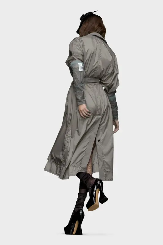 In a reversible style, the peached nylon blend trench coat is designed through the Maison's code of décortiqué, exposing the construction of the garment to create something strikingly new. With work-in-progress stitches with loose threads around the 'onion skin' panels, the layered coat is completed with a waist belt and chest pockets. Maison Margiela’s signature, the Four stitches, appear at the back; the opposite of a label.