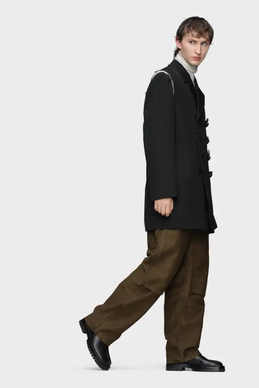 In a military-style design, this reversible, double-breasted wool coat has been transformed through the Maison’s Pressed to Death process – where heat, pressure and handpainting reshape the fabric with bold lines and a luminous finish. Maison Margiela’s signature, the four stitches, appear at the back; the opposite of a label.