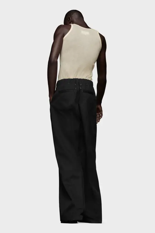 With a high-waist and pleats, the wide skater chino trousers feature the Margiela hook. The back is elasticated, with side and back pockets. Maison Margiela's signature, the Four stitches, appear at the back; the opposite of a label.