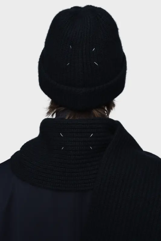 This beanie is made from finely spun cashmere in a classic ribbed knit. The folded brim adds gentle volume, while Maison Margiela’s signature, the four stitches, appear at the front; the opposite of a label.