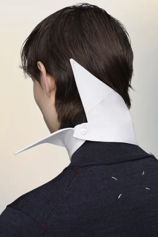 A deconstructed take on tailoring, this cotton poplin collar reflects how how present-day youth might reinterpret an inherited wardrobe. Cut with sharp lines and elongated points, it can be layered or worn alone. Maison Margiela’s signature, the four stitches, appear at the back; the opposite of a label.