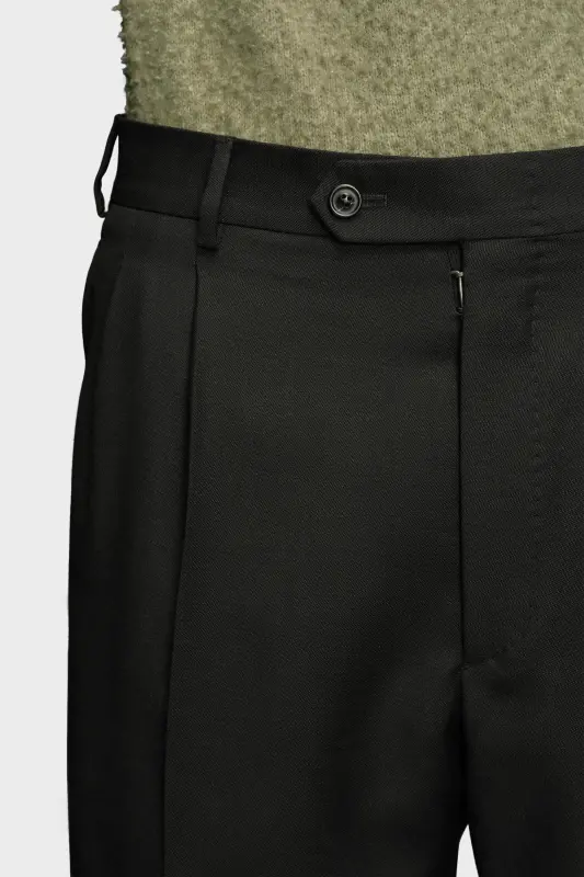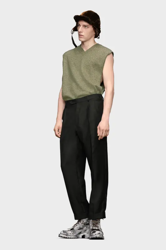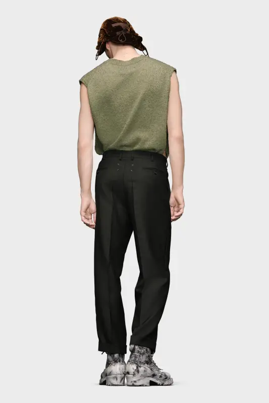 Crafted from mohair wool, the suit trousers have a slightly cropped silhouette with turned-up hems. The straight-leg design comes with pockets and is pleated down the legs with additional folds to the sides. They feature classic belt loops and a button fastening as well as the Margiela hook closure. Maison Margiela's signature, the four stitches, appear at the back; the opposite of a label.