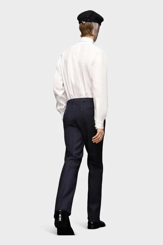 These pleated trousers in wool twill have turned-up hems and belt loops with the Maison Margiela hook and eye closure. An asymmetric pocket appears on the back with the M button and the four white stitches show the hand of the Maison: the opposite of a label.