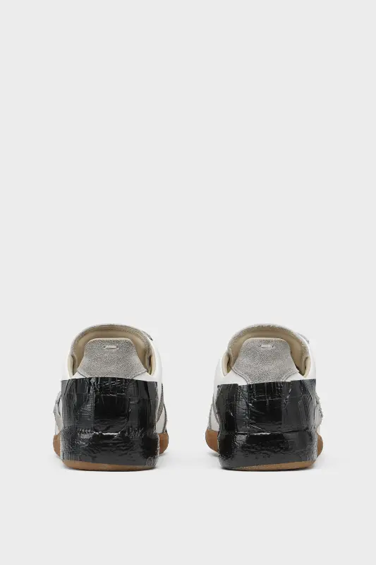 The Replica sneakers in smooth calfskin leather and suede with a honey sole. This season reinterpreted with tape detailing, a nod to the used and repaired house code. The Maison's iconic Replica sneakers are inspired by Austrian sports shoes from the seventies. Details on the Replica pairs are continually reworked in line with the season's inspirations. Maison Margiela's signature single white stitch appears at the back.​
