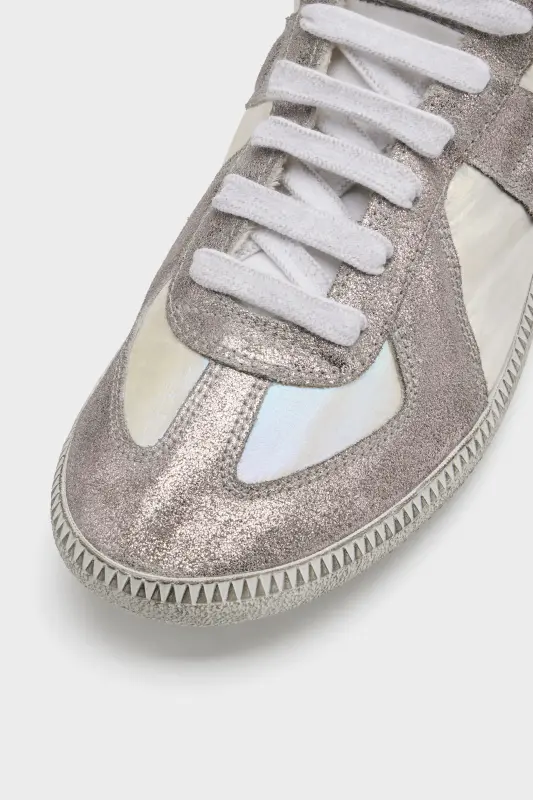 The Replica Iridescent sneakers are crafted in smooth calfskin and a glitter suede with a high-shine finish and iridescent coating that reflects coloured tones in the light. The Maison's iconic Replica sneakers are inspired by Austrian sports shoes from the seventies. Details on the Replica pairs are continually reworked in line with the season's inspirations.