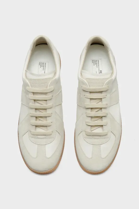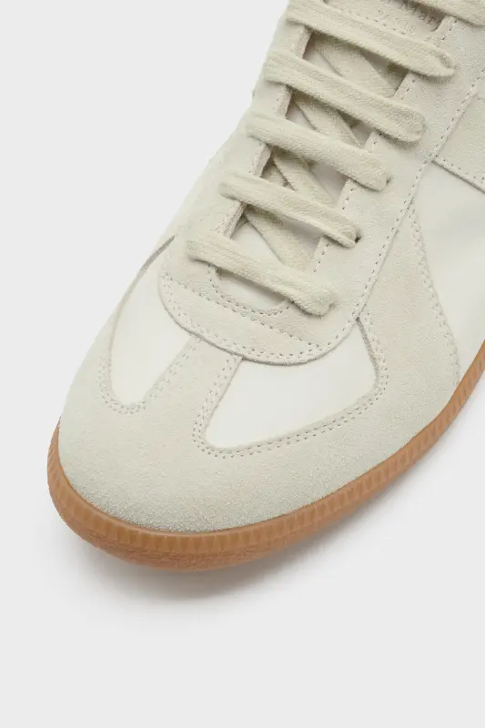 The Replica sneakers in nappa leather and suede with a honey sole. The Maison's iconic Replica sneakers are inspired by Austrian sports shoes from the seventies. Details on the Replica pairs are continually reworked in line with the season's inspirations.