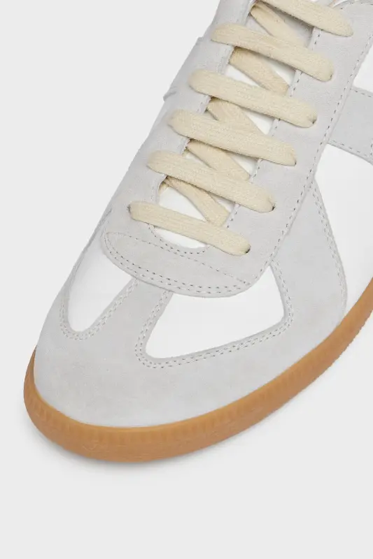 The Replica sneakers in nappa leather and suede with a honey sole. The Maison's iconic Replica sneakers are inspired by Austrian sports shoes from the seventies. Details on the Replica pairs are continually reworked in line with the season's inspirations.