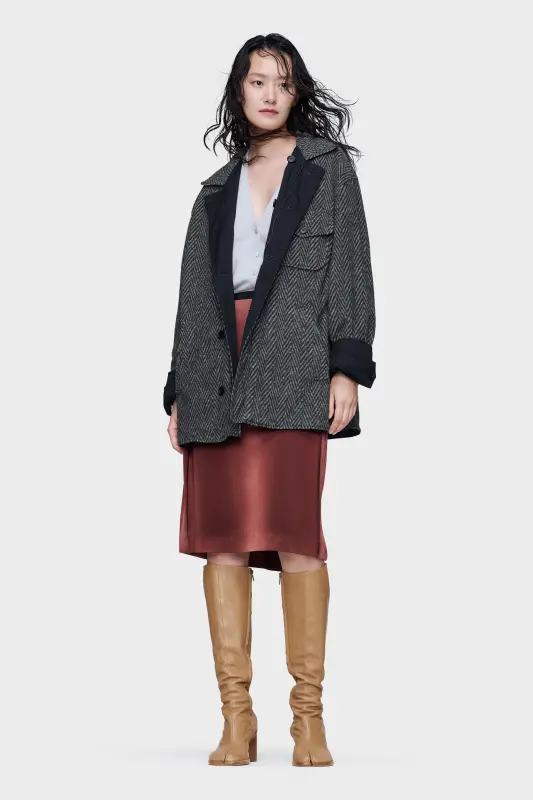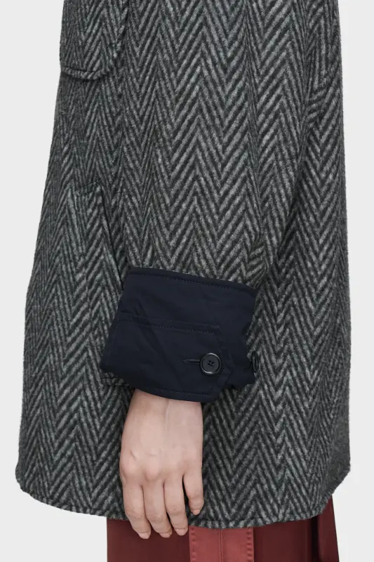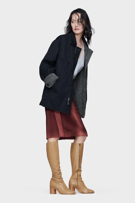 Defined by reversibility, this jacket explores material contrast. Cotton twill lends the first side its clean definition, while the reverse introduces herringbone fleece for a layered, textural presence. Each aspect retains sharp tailoring references, yet the garment itself resists singular definition. At the back, the Maison’s signature four stitches appear; the opposite of a label.