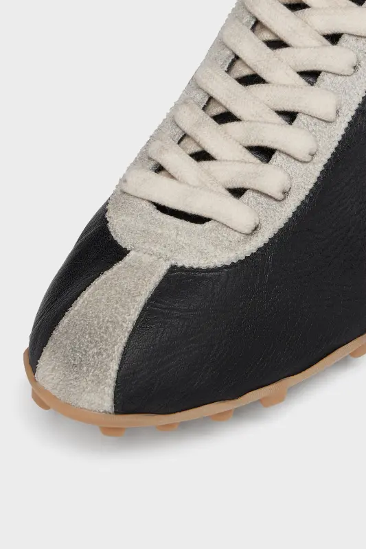 The Sprinters reinterpret vintage track shoes with a layered construction in calfskin, tripon leather, and hairy suede. Defined by bold textural interplay and tonal contrasts, the design is set on a studded rubber sole that recalls classic athletic gear. The Maison’s numeric logo marks the tongue, while code 22 appears at the outsole. Maison Margiela’s signature white stitch finishes the heel; the opposite of a label.