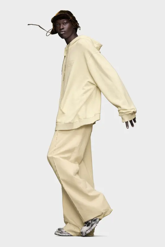 Made in cotton, the hooded sweatshirt has a zip-through design, which divides the front pocket. The numeric logo appears stamped to the side of the chest, deliberately faded in parts for a lived-in look. It is relaxed, with an oversized fit and loose, curved hem at the back. Distressed details are seen throughout with a contrast drawstring at the hood. Maison Margiela's signature, the four stitches, appear at the back; the opposite of a label.
