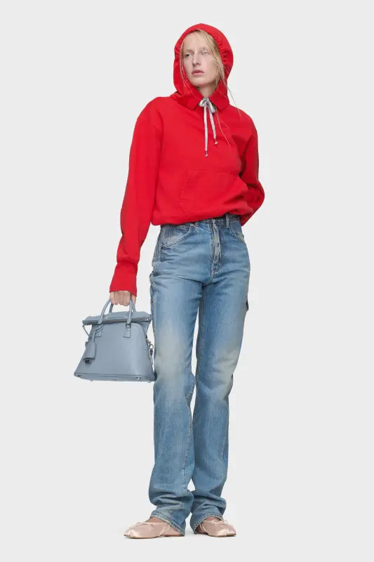 Cut in cotton denim, these jeans feature a straight-leg silhouette with subtle fading across the seams. A side utility pocket disrupts the classic 5-pocket design, while the memory of the jacron patch reinforces the Maison’s deconstructive approach. At the back, the Maison’s signature four stitches appear; the opposite of a label.