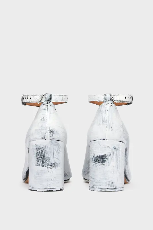 In the Maison's Bianchetto treatment, which wears for an evolving look, these nappa leather block-heel court shoes have an adjustable slim ankle strap and signature stitch at the back. They feature the Tabi split-toe, inspired by the traditional 15th century Japanese sock bearing the same name – launched for the Maison's debut collection in 1989. It captures the avant-garde and insubordinate spirit of the Maison and exists as a heritage classic, continually explored through each collection. 8cm heel.