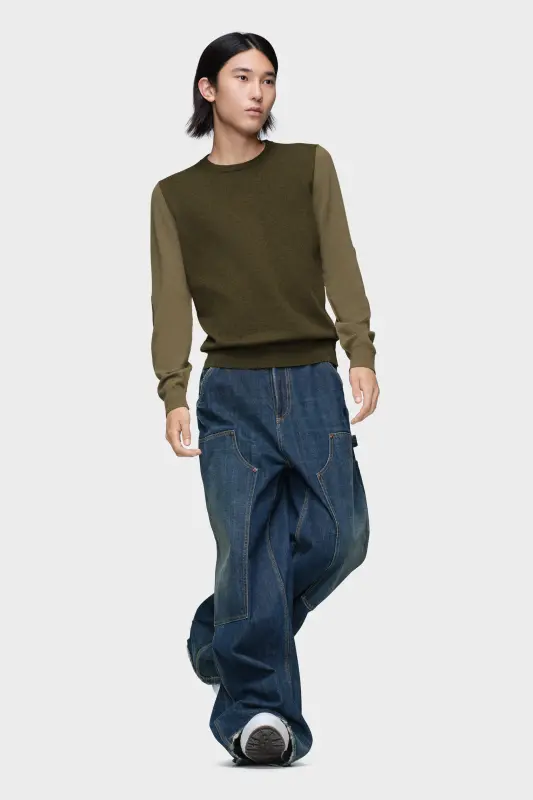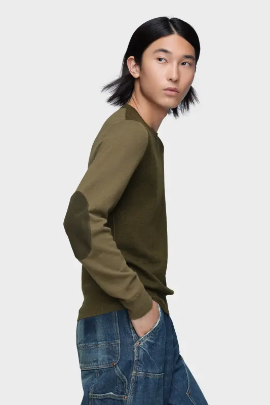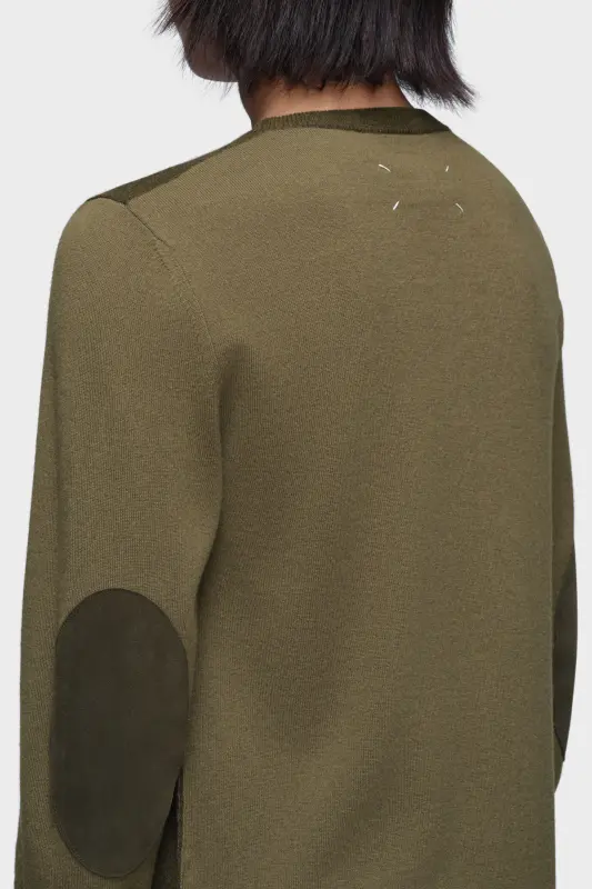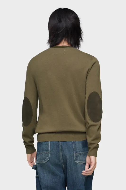 A refined staple with subversive nuance. This two-tone crewneck features contrast sleeves, tonal elbow patches and clean ribbed trims, subtly challenging the conventions of classic knitwear. At the back, the Maison’s signature four stitches appear; the opposite of a label.