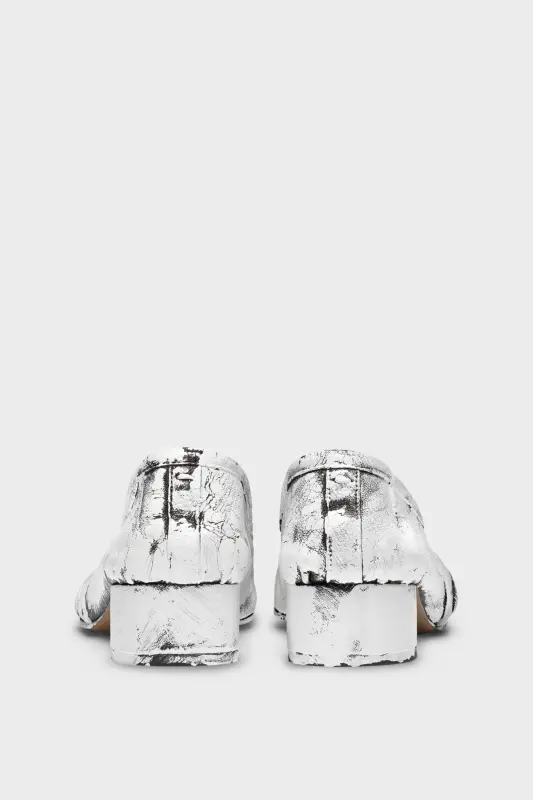 In nappa leather with hand-painted treatment, the Maison presents the Tabi new ballerinas, which take their design from ballerina shoes in the archives. They are crafted with handmade folds, manually worked to create an artisanal vintage effect at the sides. Complete with a 3cm cylindrical heel. They feature the Tabi split-toe, inspired by the traditional 15th century Japanese sock bearing the same name – launched for the Maison's debut collection in 1989. It captures the avant-garde and insubordinate spirit of the Maison and exists as a heritage classic, continually explored through each collection.