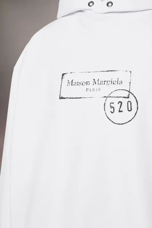 The hooded sweatshirt features a relaxed fit and ribbed trims, elevated by a muted chest motif inspired by archival industrial stamps. Reimagined as a contemporary graphic gesture, it reflects the Maison's conceptual approach. At the back, the four white stitches underscore its signature; the opposite of a label.