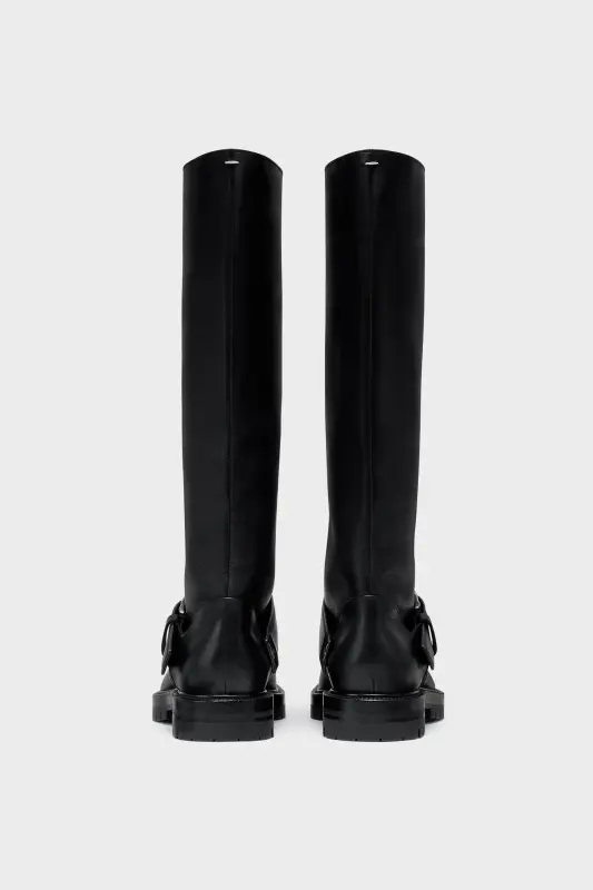 These knee-high Tabi boots are rendered in fine box calf leather with a tubular upper and heavy-duty ankle strap. They feature the Tabi split-toe, inspired by the traditional 15th century Japanese sock bearing the same name – launched for the Maison's debut collection in 1989. It captures the avant-garde and insubordinate spirit of the Maison and exists as a heritage classic, continually explored through each collection. Maison Margiela's signature single white stitch appears at the back.