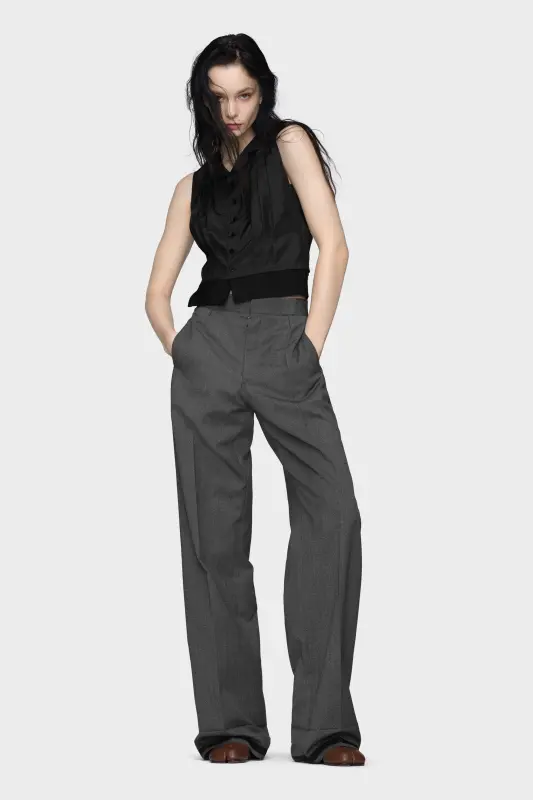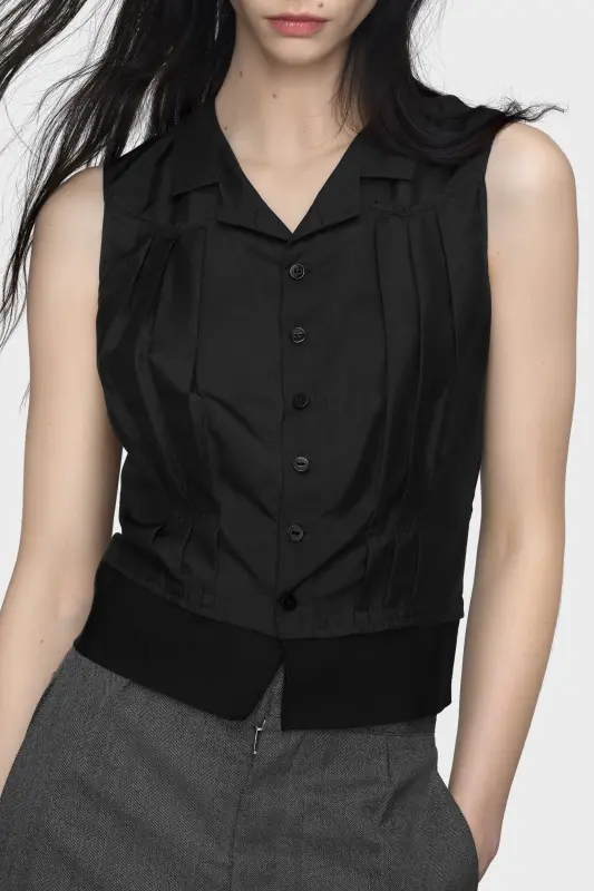 Silk tailoring is deconstructed in this sleeveless blouse, defined by sculptural pleats, exposed inner seams, and a contrast hem that gestures to shirting. A flat collar and button-up front introduce classic details, while the silhouette balances softness with structure for a modern take on traditional form. Maison Margiela’s signature, the four stitches, appear at the back; the opposite of a label.