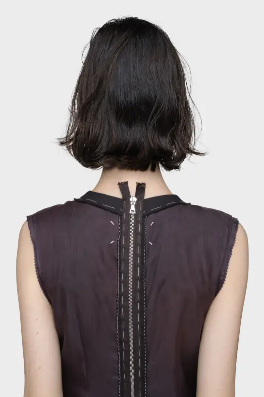 This piece deconstructs the notion of a classic dress, fusing tailored elements with internal construction. A structured waistband evokes trouser forms, stitched over a lined, raw-cut silhouette. Executed using Maison Margiela’s Décortiqué technique, the garment exposes its inner layers as part of its outer expression. Maison Margiela’s signature, the four stitches, appear at the back; the opposite of a label.