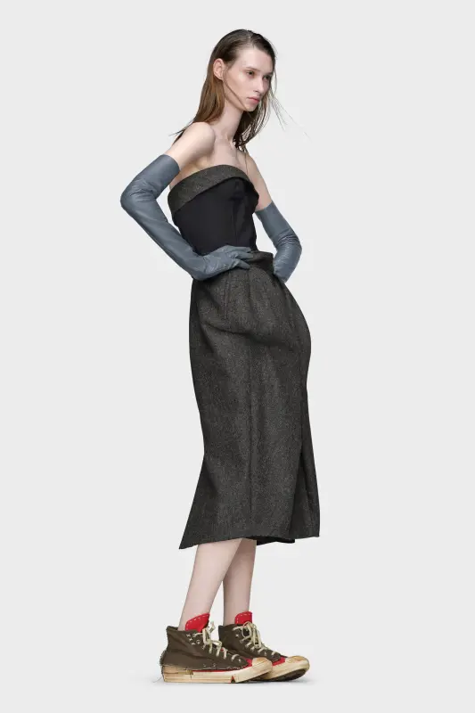A strapless wool dress that balances architectural volume with a sense of ease. The upper body is held in place by a structured bustier, while the skirt exaggerates the natural silhouette through pleats that recall the Maison's Gestural Cutting technique. At the back, the Maison’s signature four stitches appear; the opposite of a label.