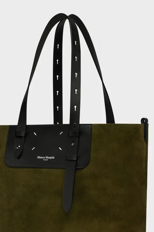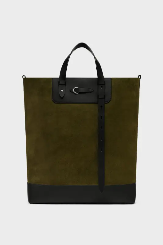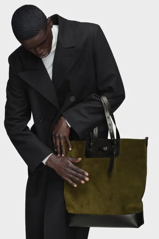 This tote explores the tension between structure and softness, combining a supple body with saddlery-inspired leather straps. Belted top handles adjust in length, while a D-ring detail and raw suede lining hint at equestrian design. The Maison’s signature, the four stitches, appear at the back; the opposite of a label.